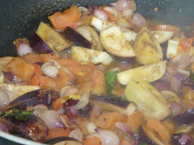 Heat half the oil in the cooking pan first. When its heated, add Hing / Asafoetida, mustard seeds and methi seeds into the oil. When they sputter, add the small onions, brinjals and drumsticks into the pan and fry them till they get translucent. Add little salt just for the vegetables to absorb and then add the curry leaves and tomatoes and fry them for a minute till they get mushy.