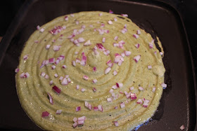 - On medium heat, pour a full ladle of the batter at the center of the pan. Uniformly spread it and make a thin circle as shown in the picture. Sprinkle some red onion pieces on its top and add oil at the edges of the circle.