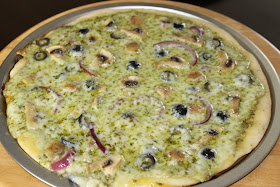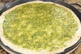 Spray some oil onto the base of the pizza baking tray. Carefully transfer the handmade thin crust into the pizza tray. Spread the Pesto Sauce on top of the Pizza base equally in all directions as shown in the picture below.