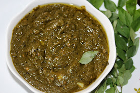 Its difficult to get good amount of fresh curry leaves in the place i live. Fortunately, I was able to get these precious leaves in abundance last week. So I decided to make the Curry Leaves kuzhambu with those fresh ones. I made it in a thicker form in order to enjoy this Karuvepilai kuzhambu at least for a week. Today its snowing heavily and I decided to make our lunch time healthier and tastier with our home favourites. Our lunch includes this spicy and tangy Karuvepilai Kuzhambu with Aviyal, Spinach Pappu and Potato curry. Preparation is simpler and does not require more efforts.