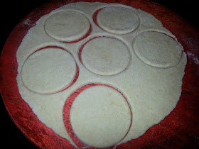 Take a portion of the outer cover dough and spread them using a Chappathi roller. It should be thicker than the regular chappathi. Using a small lid or coffee filter lid, make small rounds as shown below.