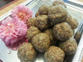On a sunny hot afternoon, my little one was asking for a dessert and wanted a yummy one. I was breaking my head and did not have an idea of what to offer. I had dates, dry grapes, jaggery as sweety things in my kitchen except multi vitamin gummy vites. Then I realized that i did not have any sweety things in my kitchen at all. ( In a way, its good!!)  I offered the dates but the demand was for a dessert only. So, in minutes, a nutty ladoo was made with all the available ingredients. Brownish nutty ladoo was made in a quick fashion with the goodness of almonds, pistachios, walnuts, peanuts, white sesame seeds, dates and little jaggery. No need to add ghee to make these ladoos as the dates itself act as a good binding agent while forming them.. But for good flavour, add a tsp of ghee and cardamom powder to the nutty mix. This ladoo can be made in minutes and its highly nutritious too...Its definitely a healthy dessert to the kids at any time.